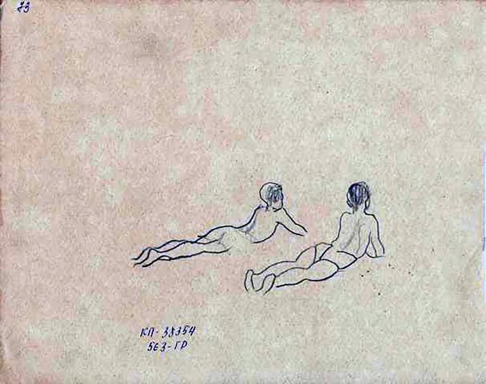 На першому плані ліворуч біля пляжного грибка лежать хлопчики, праворуч — троє хлопчиків, що сидять. На дальньому плані море. На звороті два ескізи фігур хлопчиків, що лежать на животі.
